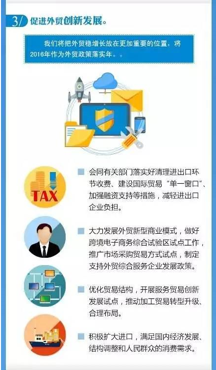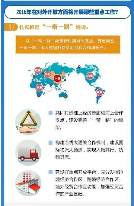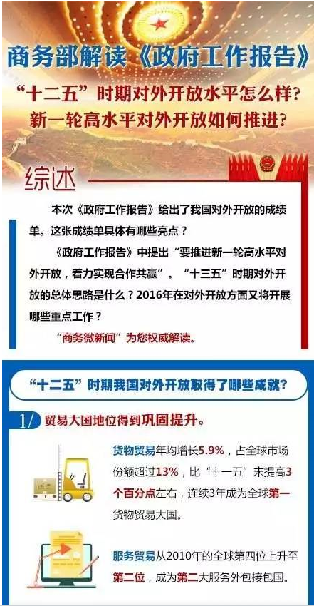 《政府工作報(bào)告》中提出“要推進(jìn)新一輪高水平對(duì)外開放,著力實(shí)現(xiàn)合作共贏”。“十三五”時(shí)期對(duì)外開放的總體思路是什么?2016年在對(duì)外開放方面又將開展哪些重點(diǎn)工作?“商務(wù)微新聞”為您權(quán)威解讀。